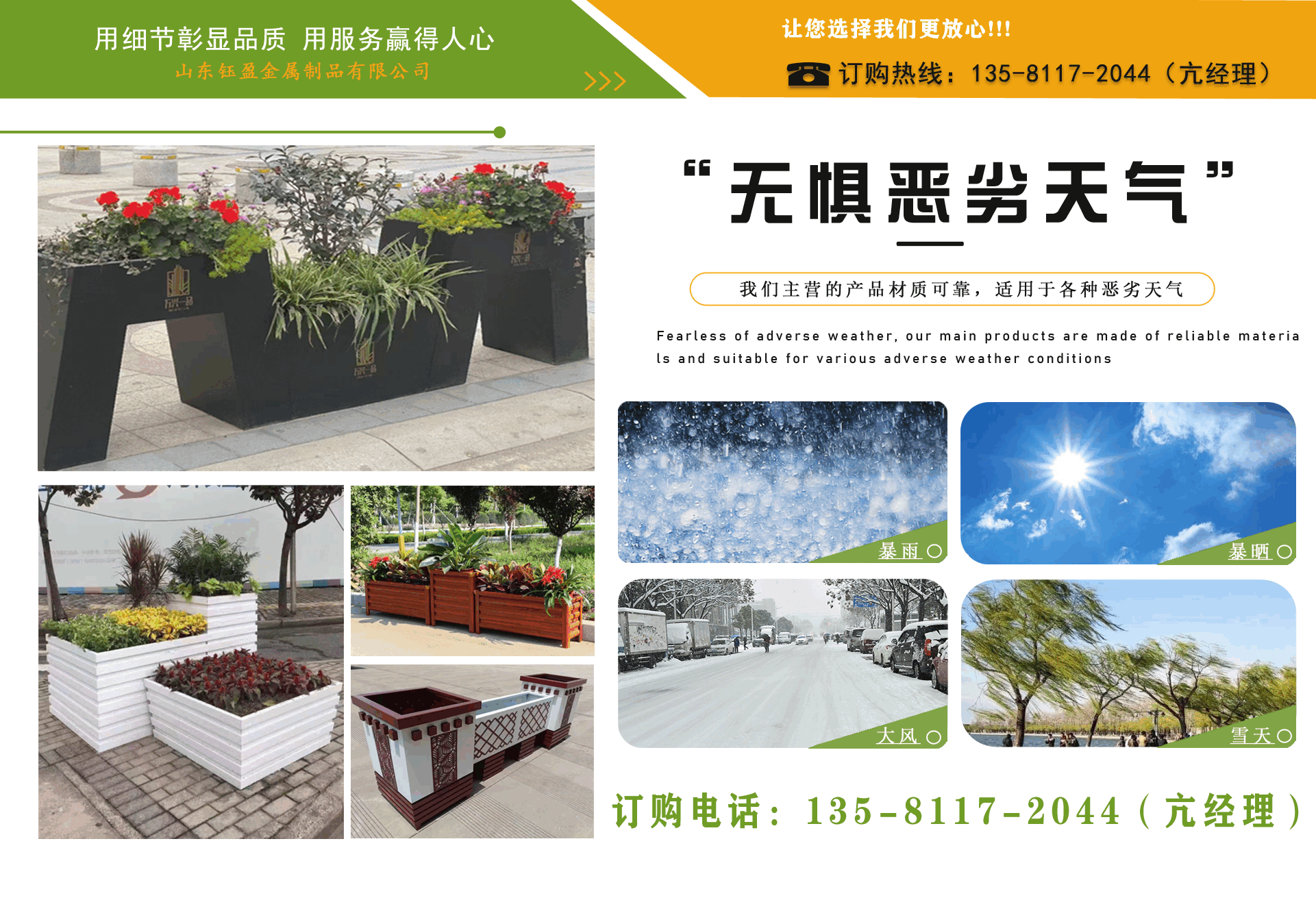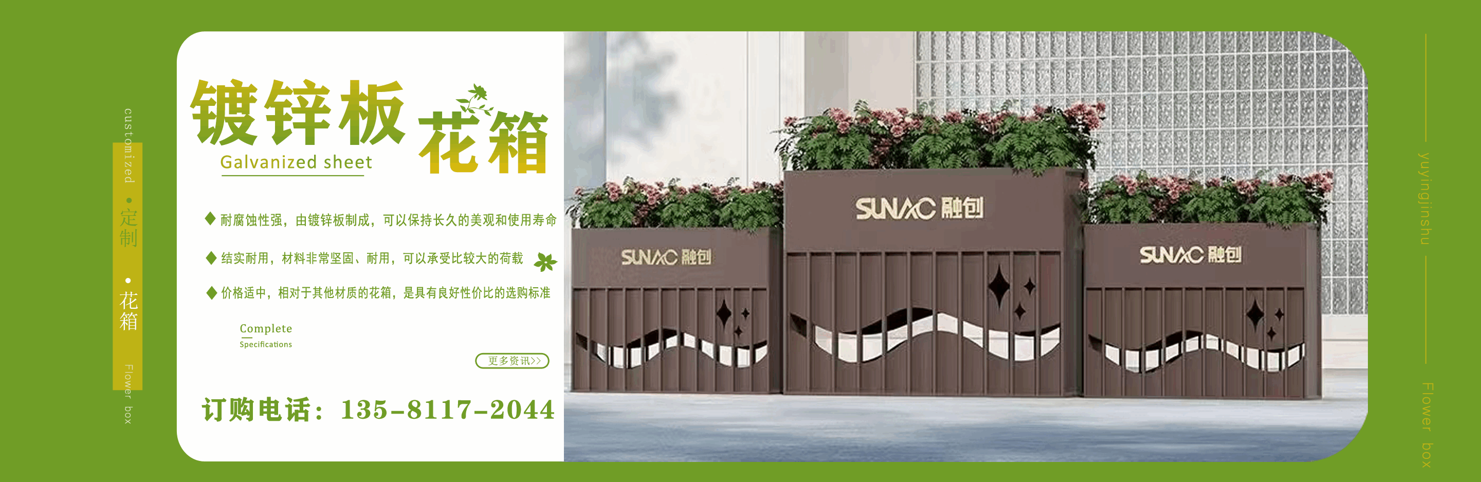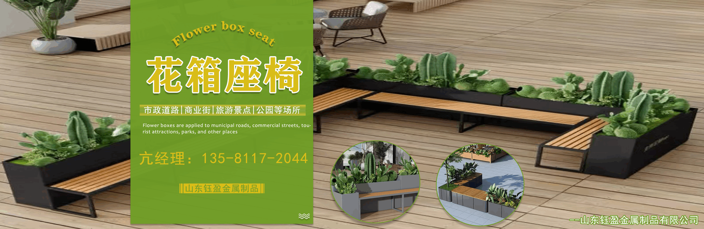 山東鈺盈金屬制品有限公司主營鍍鋅板花箱,道路隔斷花箱,定制花箱,戶外道路花箱,花箱座椅等產品,產品結構合理、性能優(yōu)良,具有強度高、耐腐蝕、抗老化、隔熱隔音、節(jié)約能源、外形美觀、使用壽命長等優(yōu)點,深受國內外客戶認可。  我們根據客戶所在城市的文化特征,制造出符合當地城市文化氣息的自然立體、觀賞性強的花箱產品成為城市里一道靚麗的風景線。  公司實行誠實、公正、守信、價格合理、平等互利。  公司憑借雄厚經驗實力,恪守誠信為本的原則,得到了眾多客戶的信賴,并在業(yè)界獲得良好的口碑。建立了穩(wěn)固的合作關系,隨著業(yè)務的不斷發(fā)展和壯大,合作伙伴的范圍也在不斷擴大。我們熱情盼望與您的合作,為社會的可持續(xù)發(fā)展獻上一份努力。...